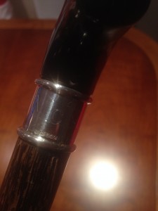 So that was that. We knew the handle would be a black buffalo horn ‘crutch’ style and the shaft would be Black Palmira. Stewart had always wanted a Sterling Silver collar engraved with his family initials, and after looking at a few options we decided on a beaded collar with the initials about ¾” high which turned out to be perfectly balanced for the size of stick.